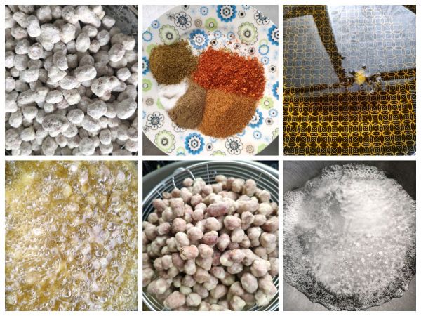 倒入大漏勺,筛去多余淀粉!准备调料,孜然粉+五香粉+花椒粉+辣椒粉+盐(根据自己口味,适当调整)锅中倒油,油温4成热倒入裹好粉的花生米,炸至微黄捞起,控油!在从新在锅中倒入小半碗水+100克白糖煮