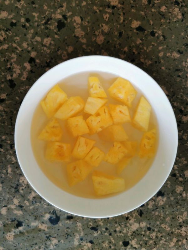 切好的菠萝放在淡盐水里浸泡,去涩。