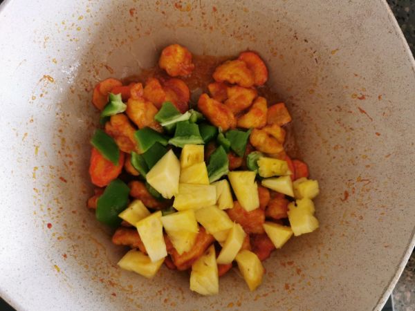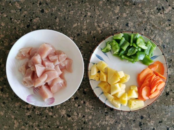 准备食材:鸡胸肉切小块、菠萝切小块、胡萝卜切片、青椒掰碎。