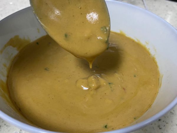 二八酱里加入1勺盐和70毫升水稀释一下(水分次倒入)调成酸奶状态算是澥好了,放一旁待用;
