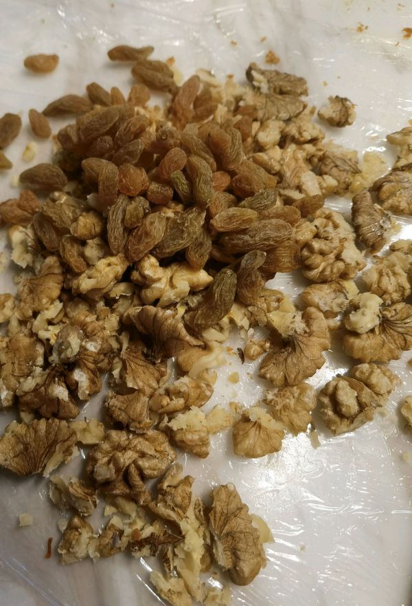 发面的食材忘拍了,略过开始准备馅料,核桃压碎,加入葡萄干搅拌均匀