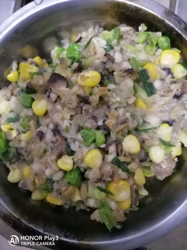 前腿肉或梅头肉洗净,剁碎或搅碎;马蹄去皮洗净剁碎;香菇用温水泡软后去蒂剁碎;玉米粒、甜豆粒洗净后,放入油锅中翻炒30秒,加入适量清水煮20分钟后,捞起放凉。瘦肉沫用食用油、白糖1克、料酒、淀粉拌匀腌制半个钟后,加入其他食材,放入香油,根据个人口味放入盐和鸡精适量,再放入白糖两克拌匀做成馅料。