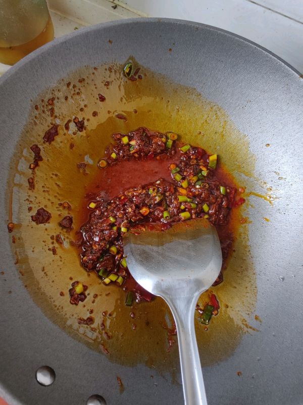 锅里热油,放入郫县豆瓣酱,一小块火锅底料(大概20g,最好是牛油的)和葱,姜,翻炒出红油。