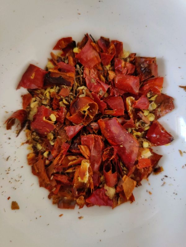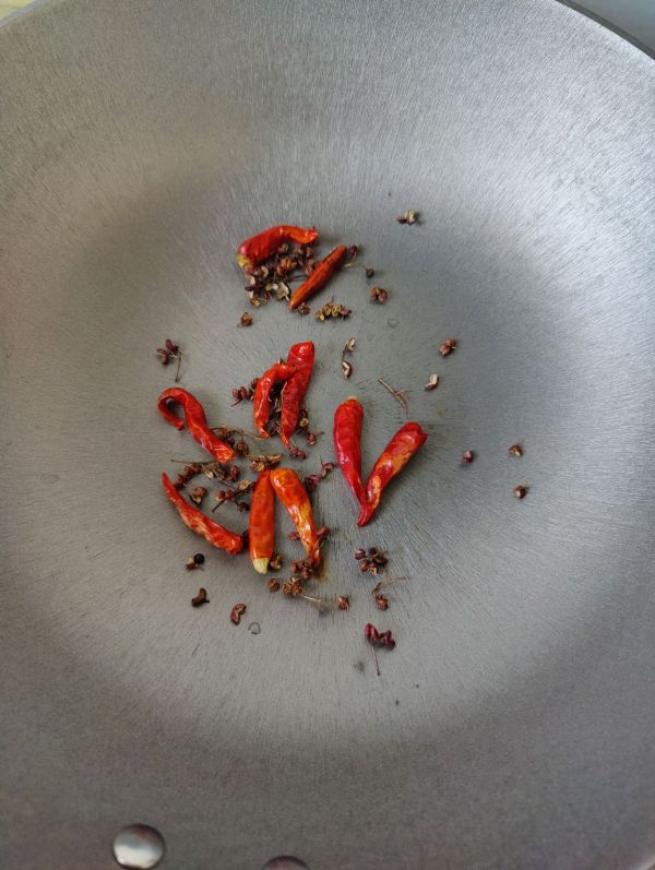 把干辣椒和花椒放到锅里,用小火干煸,当红辣椒变成暗红色,关火铲出。(如果家里有现成的辣椒面与花椒面,可以省略这一步)