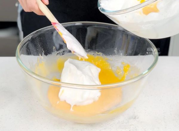 蛋白霜分三次倒入蛋黄糊中,沿着边缘从底部往上翻拌均匀(切勿画圈搅拌,会导致消泡);