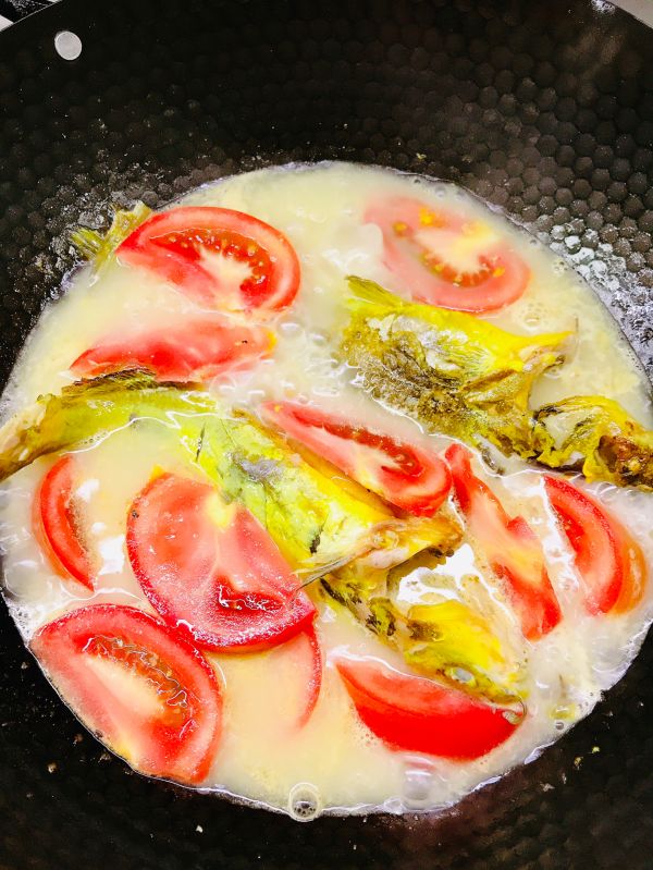 锅中放油烧热,放入姜片炒香,放入黄骨鱼煎至微黄,放入开水大火烧开