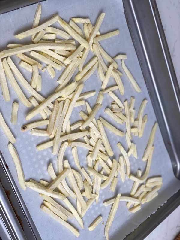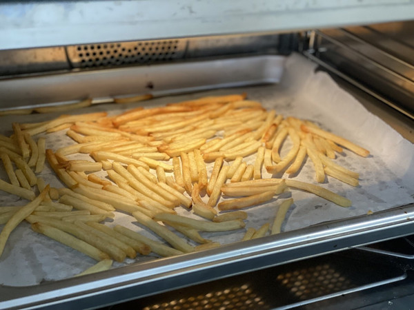 3.薯条为顶部热风模式200度15分钟,可分盘进行烤制。