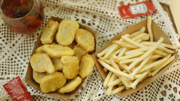 2.GD蒸烤箱使用顶部热风进行200度预热8分钟,预热结束后,放入GD蒸烤箱,中层。鸡块为顶部热风模式200度17分钟。