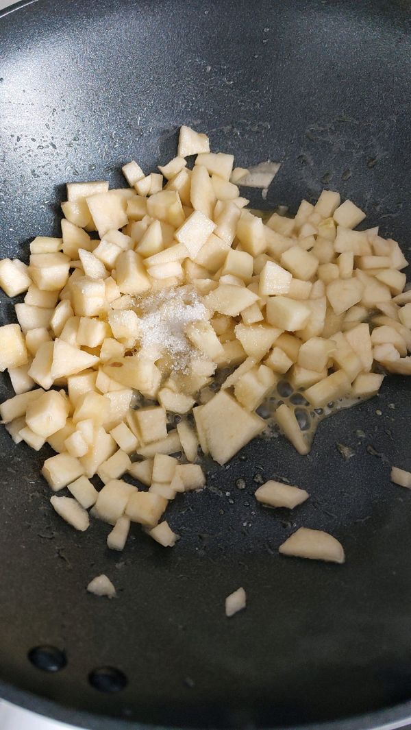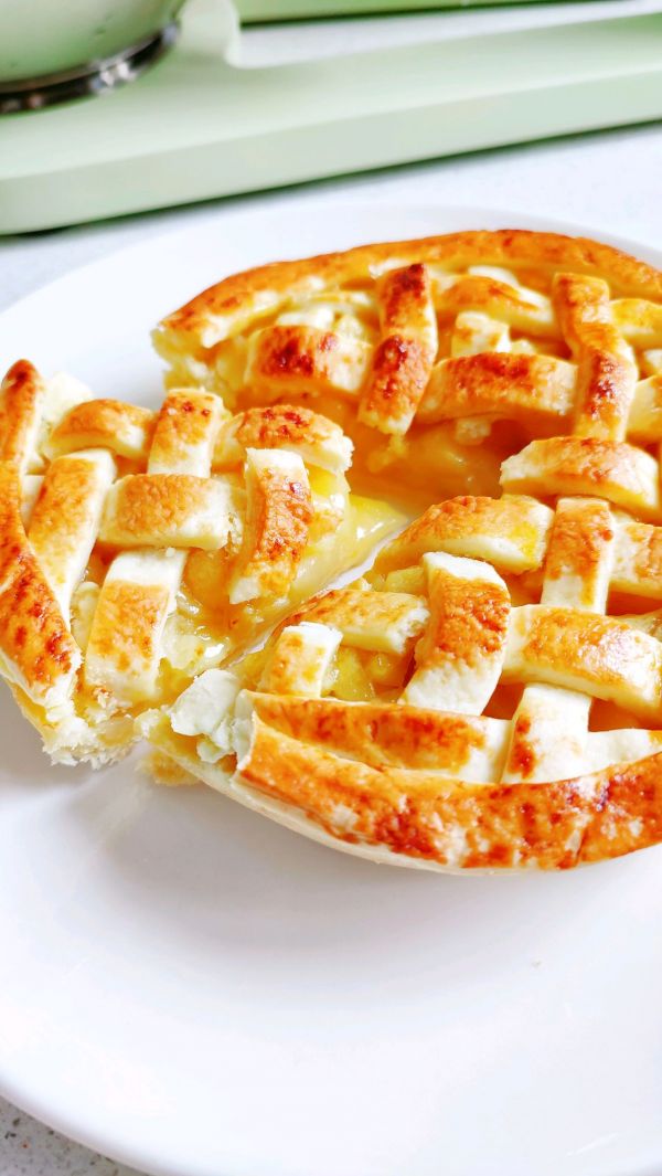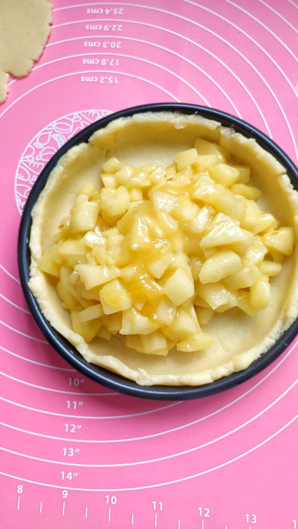 13.炒好的苹果馅舀到披萨盘中(如图所示)