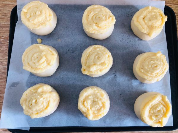 全部操作完以后,放在垫了烘焙纸的烤盘上,盖上保鲜膜室温发酵到两倍大。 快发酵好的时候预热烤箱上下火190度,时间15分钟。