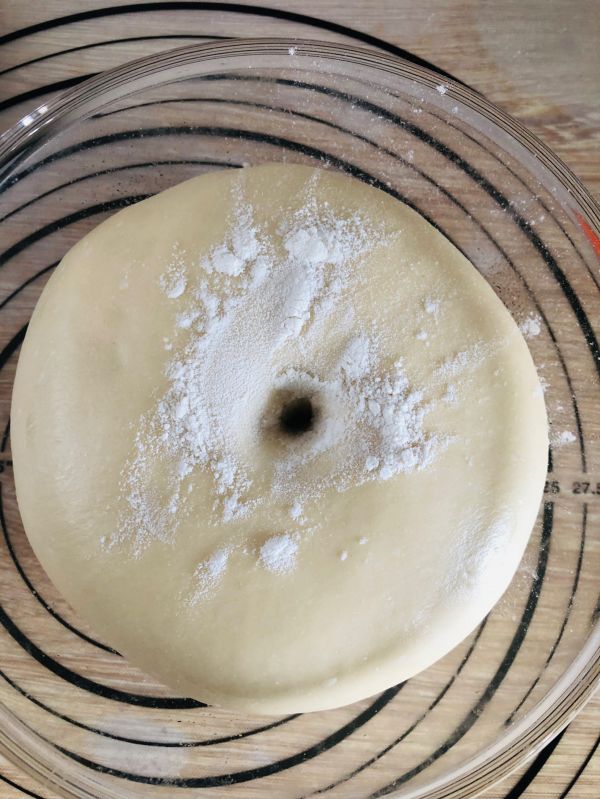 这时候面团也大概发酵好了。 现在天气热,我在室温下大概发酵了50分钟就可以了。面团发酵到两倍大,手指沾面粉戳一个洞不回缩或者缓慢回缩就可以了。