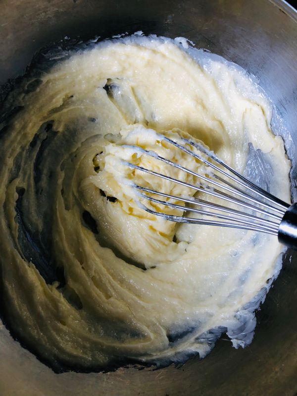鸡蛋打散,鸡蛋液分三次加入黄油搅拌。这里的鸡蛋一定要用室温的,不然会水油分离。