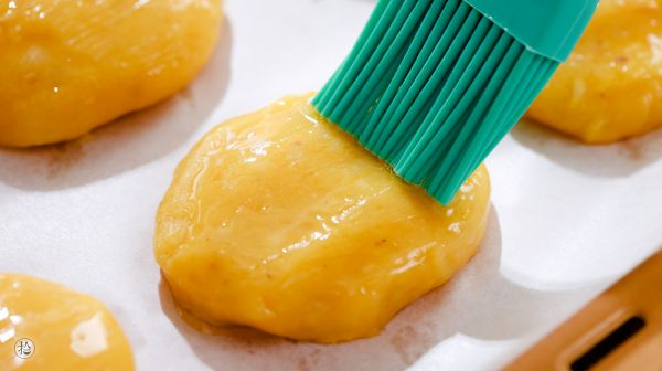 放入提前预热180℃的烤箱中层,上下火180℃烤约15分钟,取出翻面。