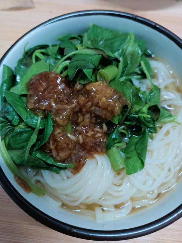 碗内捞如面条,用勺倒荆芥料汁,然后挖一勺蒜汁浇上,即可开吃