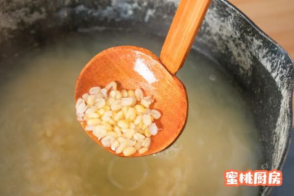 将泡好的去皮绿豆冷水下锅,煮30分钟至绿豆都开花