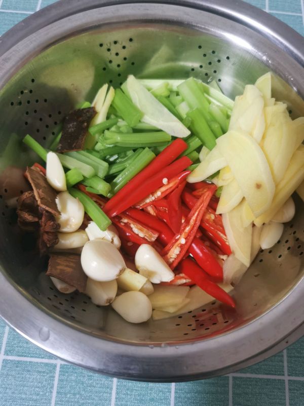 准备好配菜,姜,蒜,小米,辣芹菜,桂皮,八角,看自己的喜好,吃辣的就可以多放一点