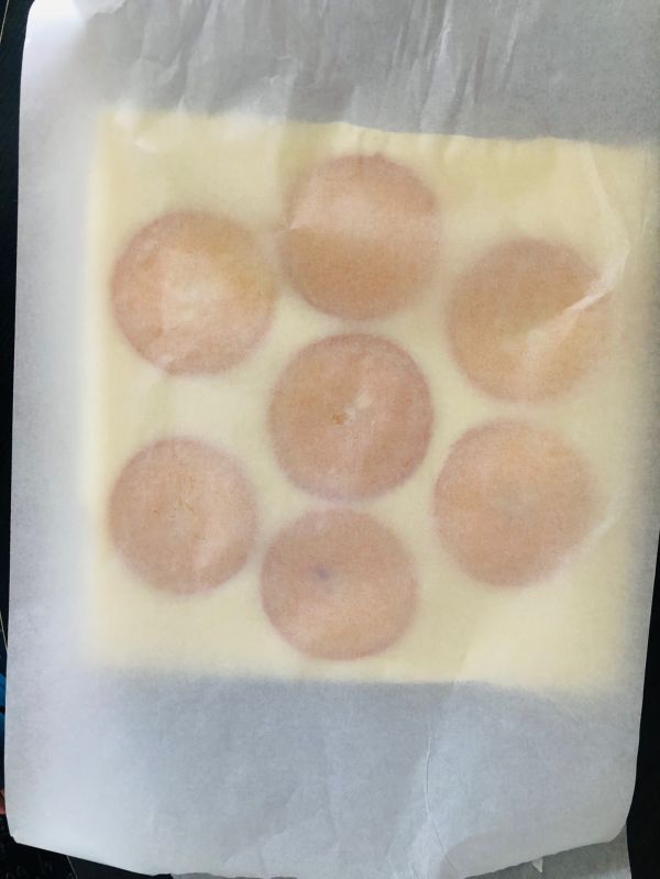 28×28公分的方形烤盘,铺上油布,放上橙子片。橙子片表面水分需要完全擦干。
