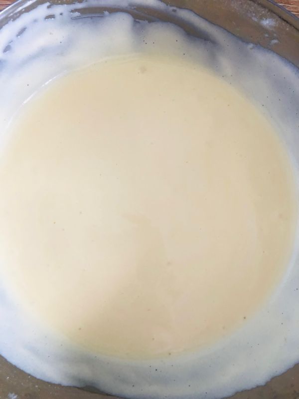 蛋糕糊倒入之前的烤盘中,轻轻震几下,震出大气泡。