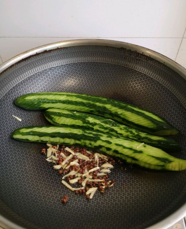 姜丝煸出金黄色 花椒受热煸炒出香味儿来 就可以放入切螺旋转的黄瓜了 … 保持中小火…