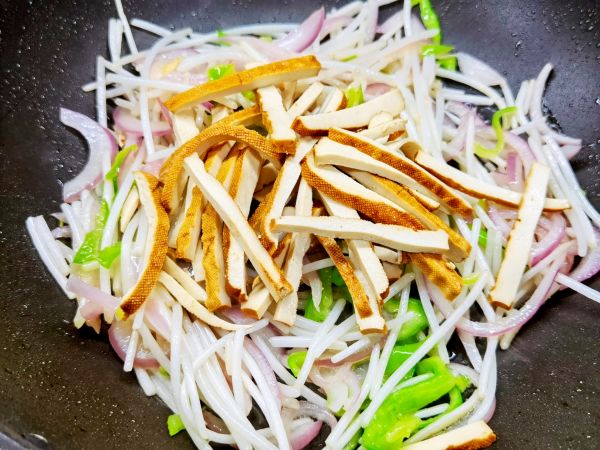 食材准备:绿豆芽摘去两头清洗干净,豆干切条,洋葱青椒切丝。