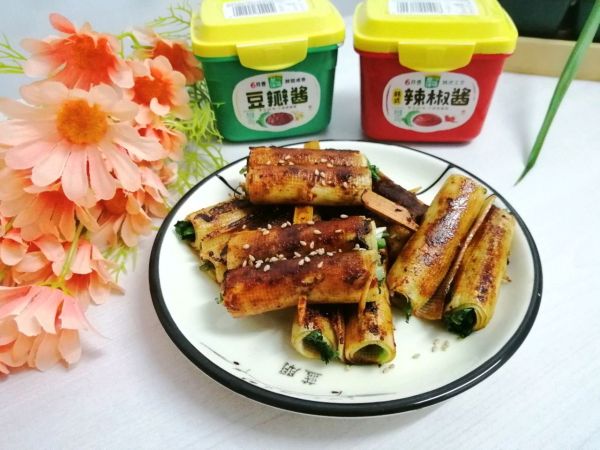 电饼铛刷一层油,将穿好的豆腐卷放入