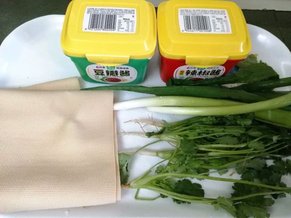 取一片干豆腐,放上香菜,葱丝,卷成卷