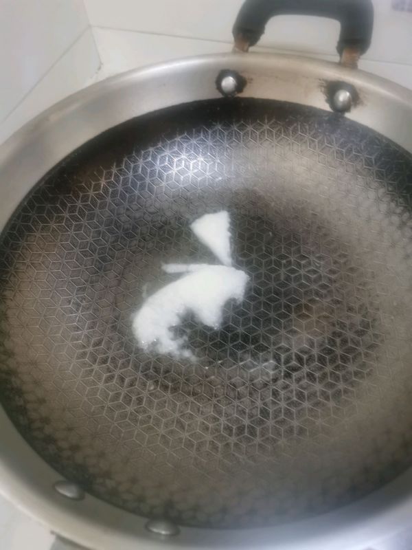 倒入鸡蛋块继续翻炒,加盐搅拌均匀。