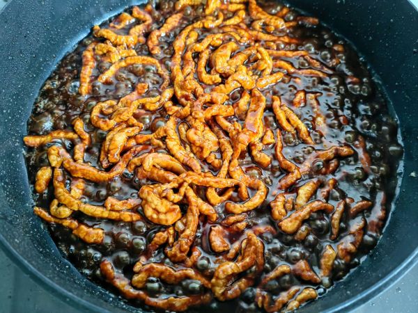 中火翻炒至每一根肉丝都包裹上酱汁。