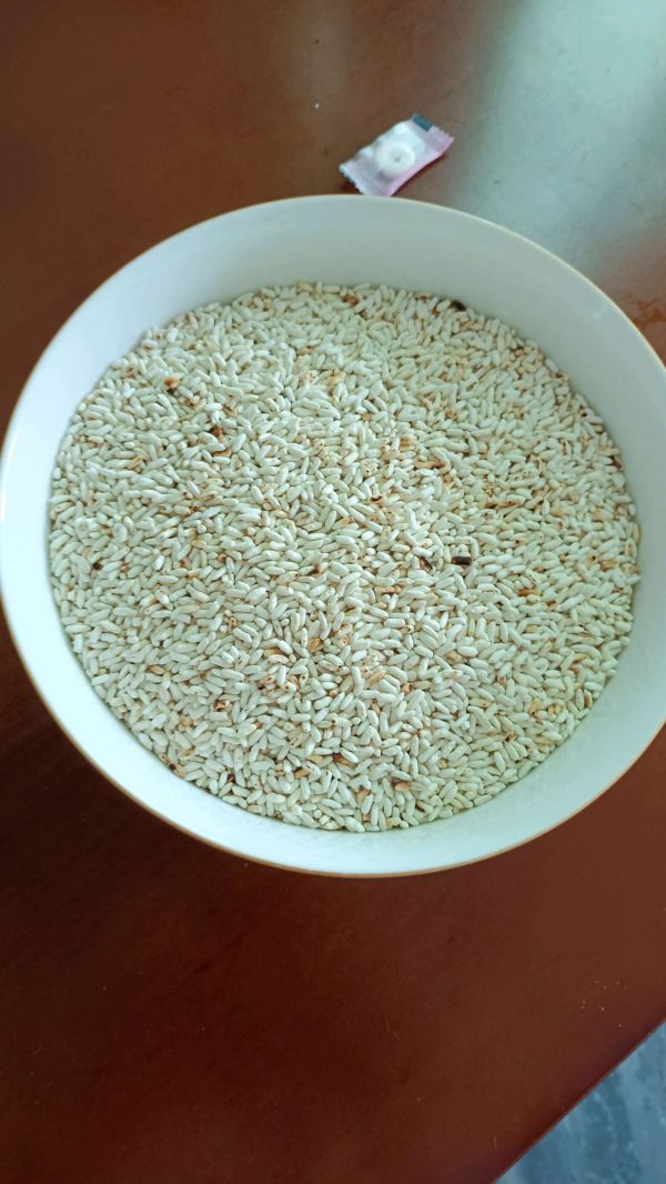 糯米炒制微微变色即可盛起来,网上食谱有些在炒的时候放白酒,我是炒完打碎后和辣椒面一起放的