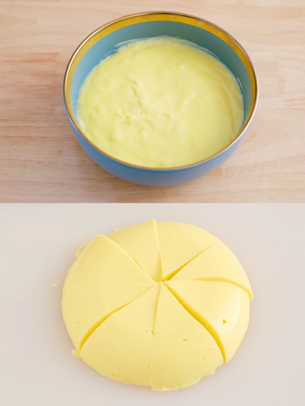 盛到大碗里,冷却,再放入冰箱冷藏三个小时… 冷藏好后,就变成固体状态,直接倒在案板上,用刀切成八块。