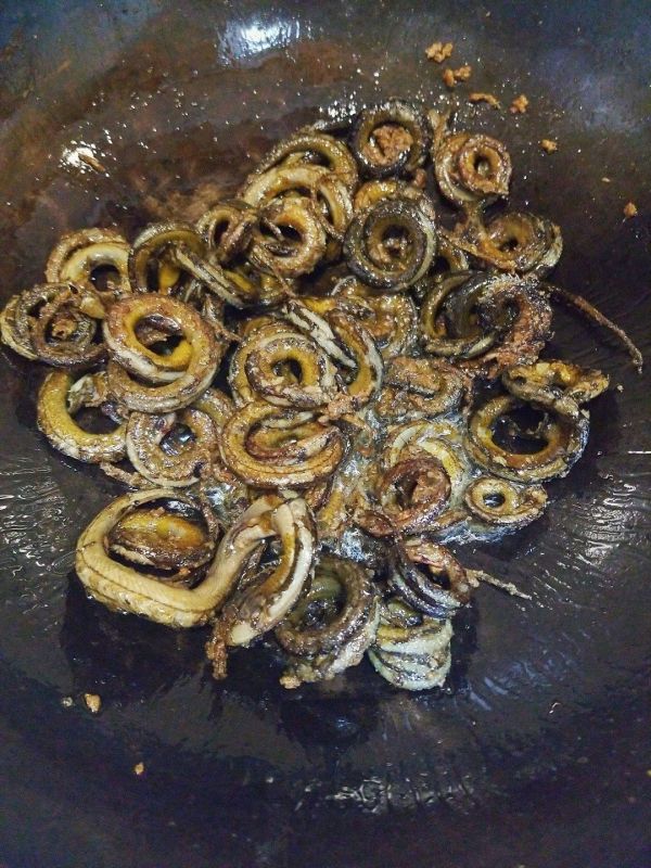 鳝鱼死了后洗干净粘液,起锅烧油撒上适量盐,放入鳝鱼进去煎至两面干香后盛出。
