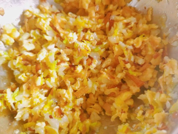 鸡蛋凉凉后拌馅,挤干水的白菜,炒好的鸡蛋,虾皮,放入盐,胡椒粉,鸡精,炸好的葱姜末油