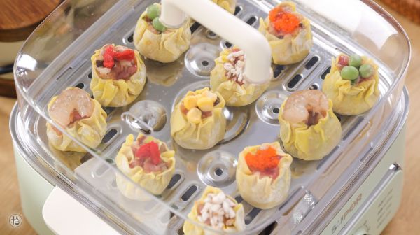 蒸锅刷上少许油,放上烧麦,摆放上辅料。