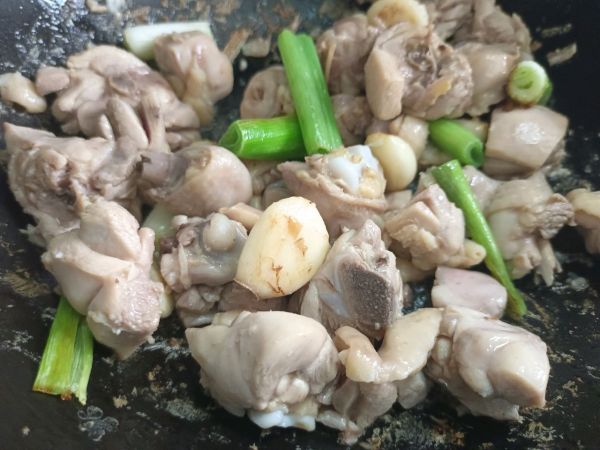 下入鸡肉翻炒均匀。淋入一汤勺的料酒。