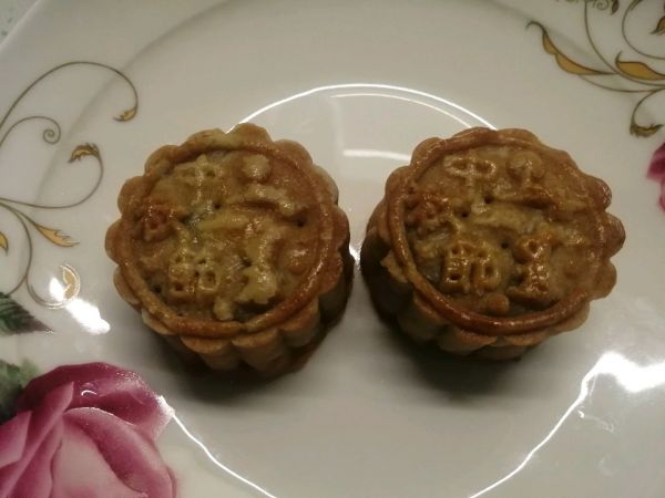 月饼压花完成喷水,并扎眼儿(馅稀了,以防开裂)。实践证明,这步是有效的。入烤箱170℃4分钟定型后拿出。晾温了刷蛋液。再入烤箱中层,150-160℃烤16分钟拿出,晾凉回油。