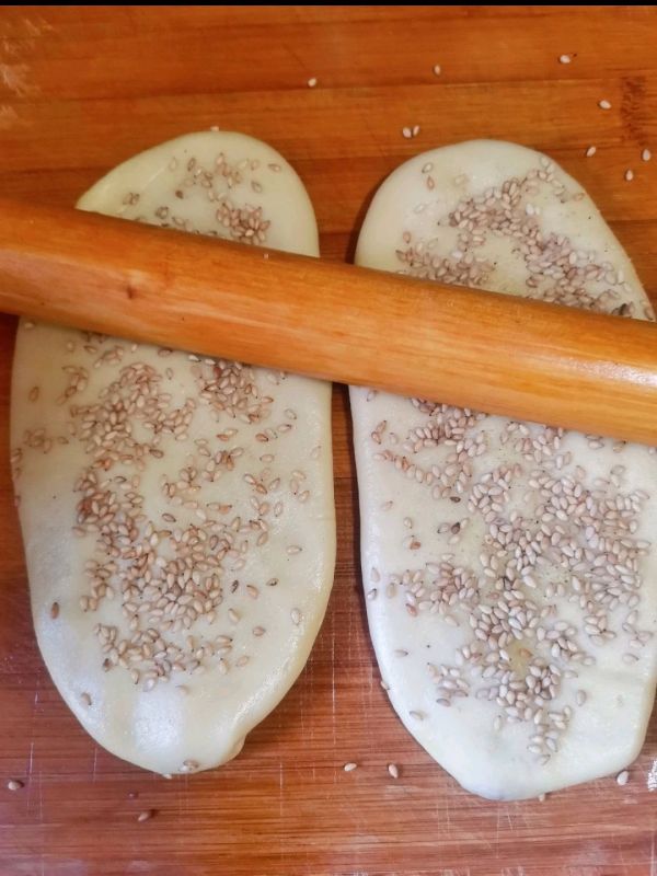 从中间捏紧,然后翻面过来,轻轻的用擀面杖再压成牛舌状,撒上芝麻椒盐,轻轻压实