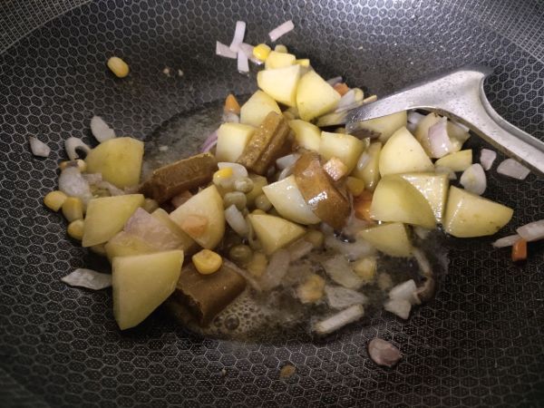 放入咖喱块,胡萝卜豌豆粒炒