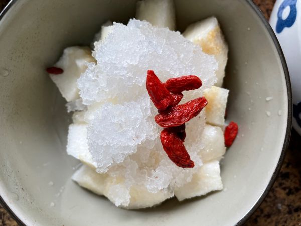 雪梨去皮去核切小块放碗中(半个雪梨一碗)