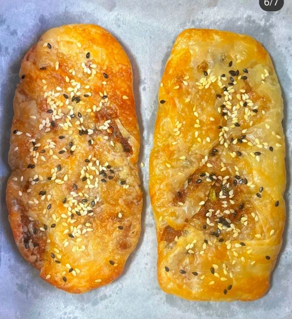 整理成牛舌状的薄饼,然后撒上芝麻和葱花