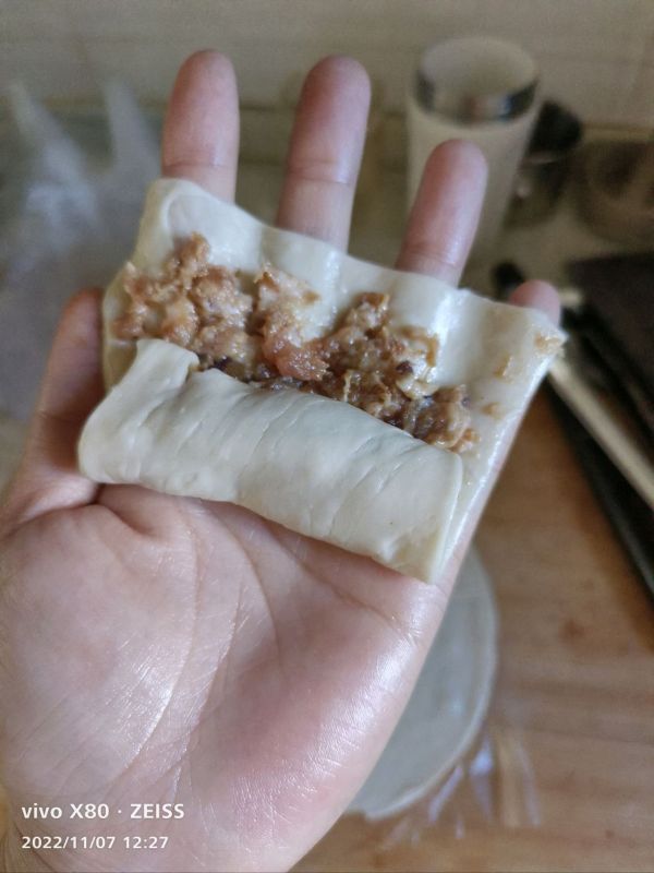 由一角向上卷起,并将三个方向的口都封住(这里也可以像包包子一样,用面皮把肉馅包起来!)