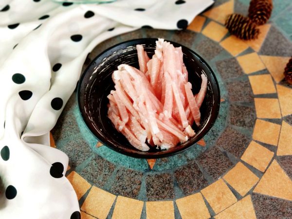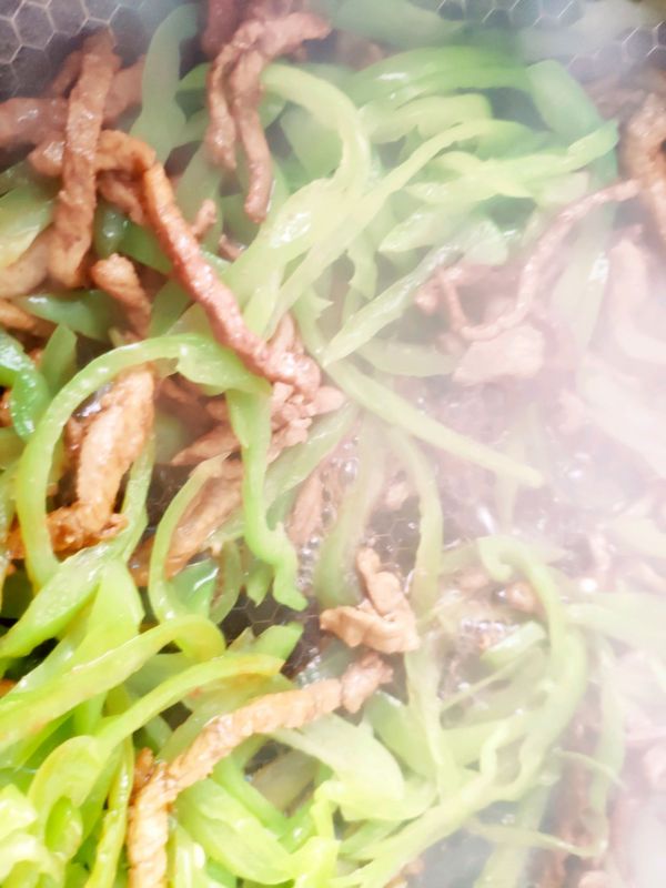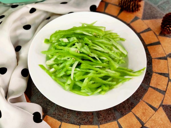 锅中加水,水开放入青椒丝,大约10秒左右,捞出,过凉,控干水分。