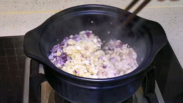 砂锅放油,先下入肉末炒到变色,下入洋葱、蒜