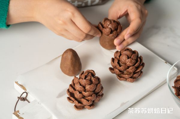 接下来组装:降温好的馅料,分成50g一个,塑形成小山丘的样子,然后将可可玉米片从上往下安装