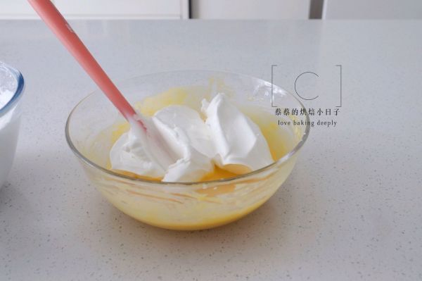 把1/3蛋白霜放入做好的蛋黄糊中,用刮刀翻拌的方法拌匀。