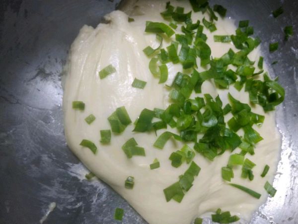 早上提前从冰箱拿出,准备一把小葱切成葱花,切好的葱花加入搅一搅,顺便给面排气,再给它静置15分钟