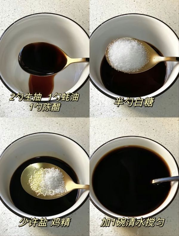 先调个酱汁,两勺生抽,一勺蚝油,一勺陈醋,半勺白糖,少许盐和鸡精,再加一碗清水搅匀备用