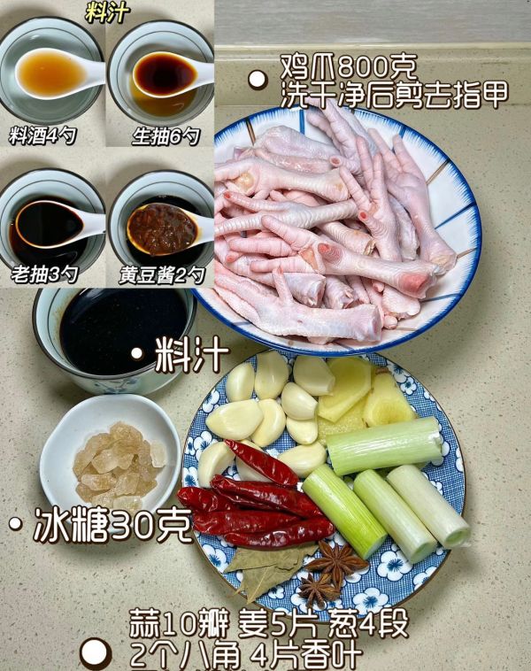 如图翻炒后加料汁,倒入没过鸡爪三分之二的热水,大火煮沸后转小火炖煮40分钟收汁即可