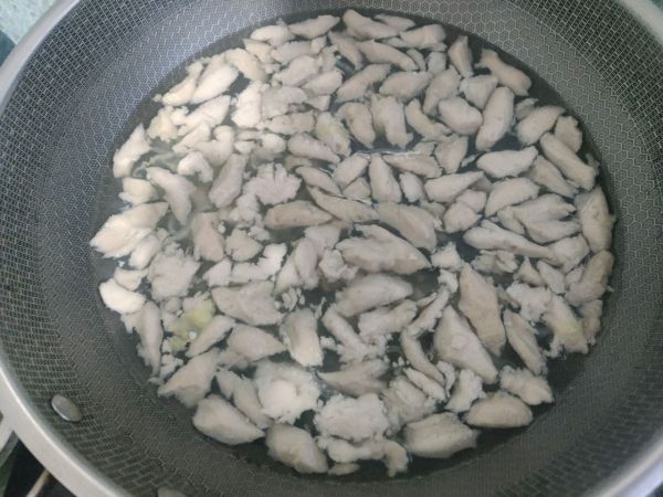 搅拌机中加入木薯粉。如果选用地瓜粉,得先用葱姜水溶解一下。