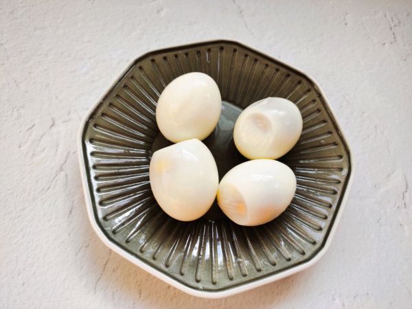 先煮一下鸡蛋,水开继续煮8分钟左右即可。煮好的鸡蛋马上冲凉水,冷却后剥壳。