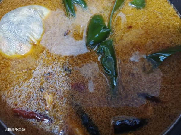 在卤汤内加入干豆腐节,炸好的辣椒,肉丸子,鸡蛋,火腿肠,炸好的豆腐,盐,炖煮半个小时